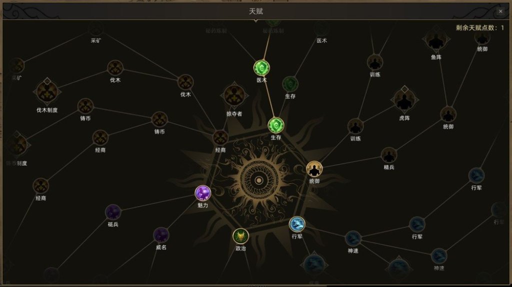 除了戰鬥技能外,還要點被動用的天賦,像是經商、統御、政治等,會影響到帶兵的數量,以及各區聲望等等。